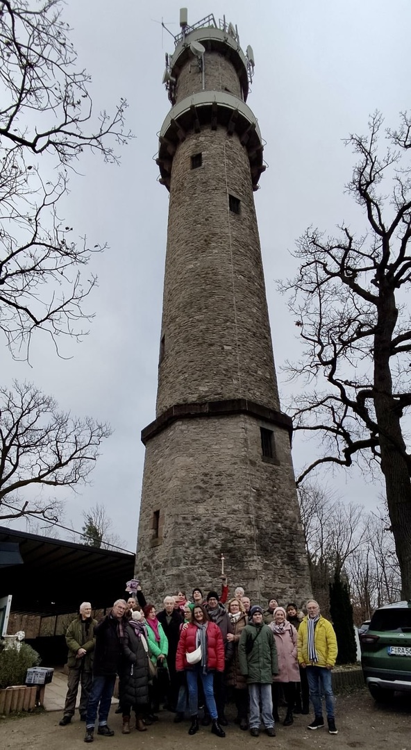 Unterwegs legte die Gruppe an verschiedenen Punkten kurze Stopps ein, um Informationen zur Region zu erhalten und den Fragebogen auszufüllen. Einen längeren Aufenthalt gab es dann an der „Dicken Tanne“. Hier gab es leckere Snacks, Glühwein und warmen Tee, die auch in diesem Jahr wieder von den Mitgliedern mitgebracht wurden.